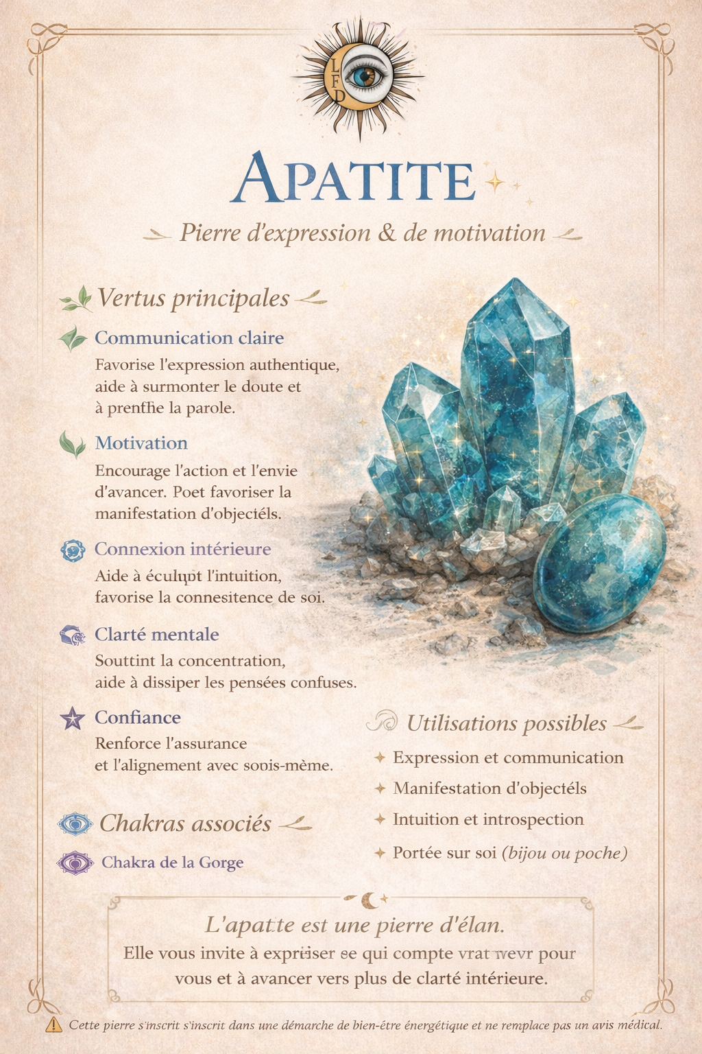 👉 Les vertus et bienfaits de l’apatite sont présentés sur les photos du produit.
