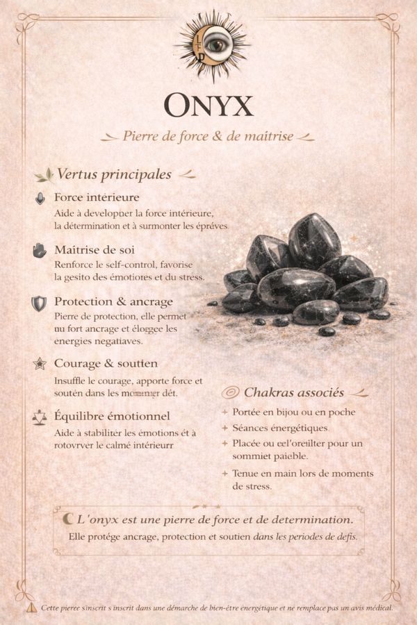 👉 Les vertus et bienfaits de l’onyx sont détaillés directement sur les photos.