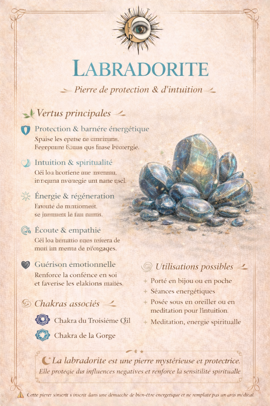 👉 Les vertus et bienfaits de la labradorite sont expliqués sur les photos.